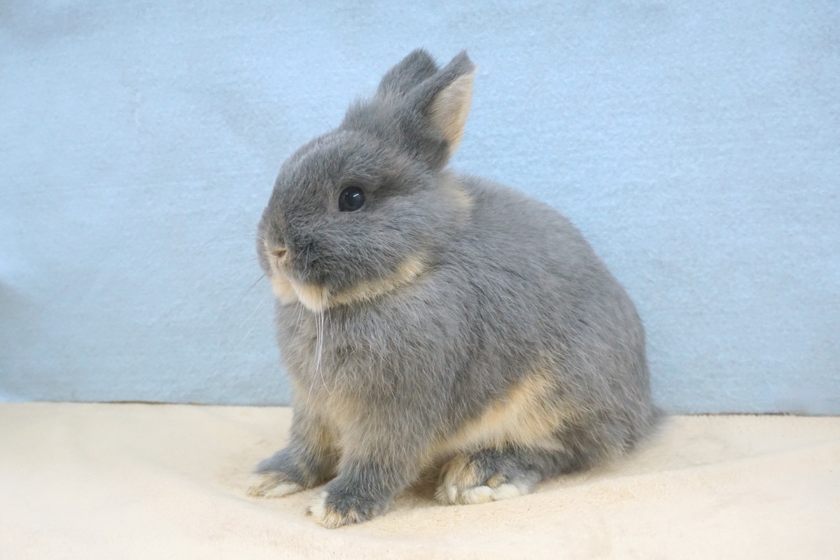 撮影時は生後3ヶ月半頃で、写真では大きく見えますが、実際はまだ小さいです。ですが現体重は1019gと少し大きめなので、将来はずんぐりとした大きめのふかふかなうさちゃんに育つと思います。